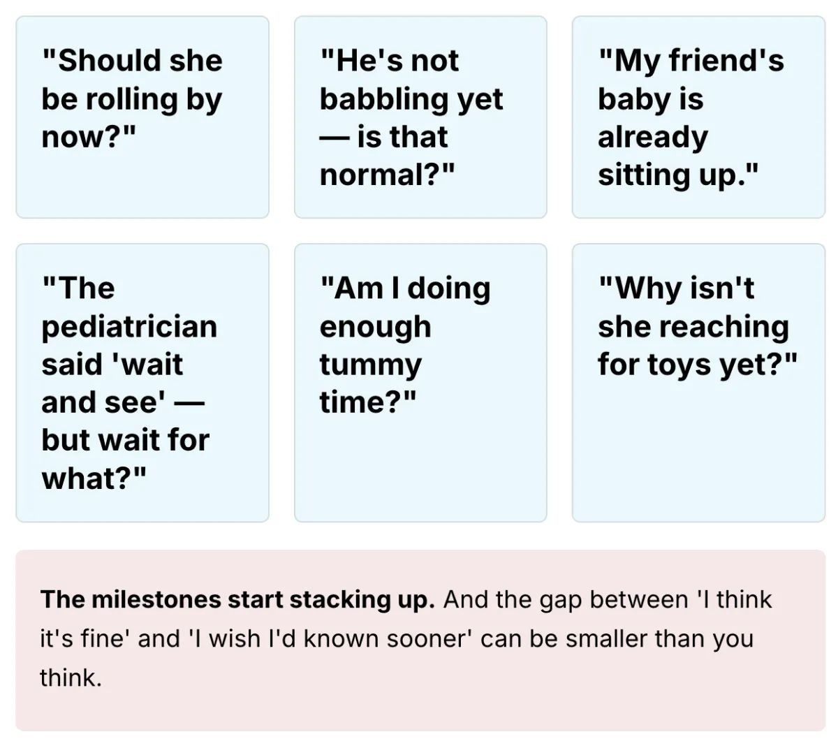 You open Instagram to relax. Instead you see a 4-month-old already sitting up, a 6-month-old 'ahead of schedule,' and a TikTok reel about a red flag — with zero context about whether it actually applies to your baby.