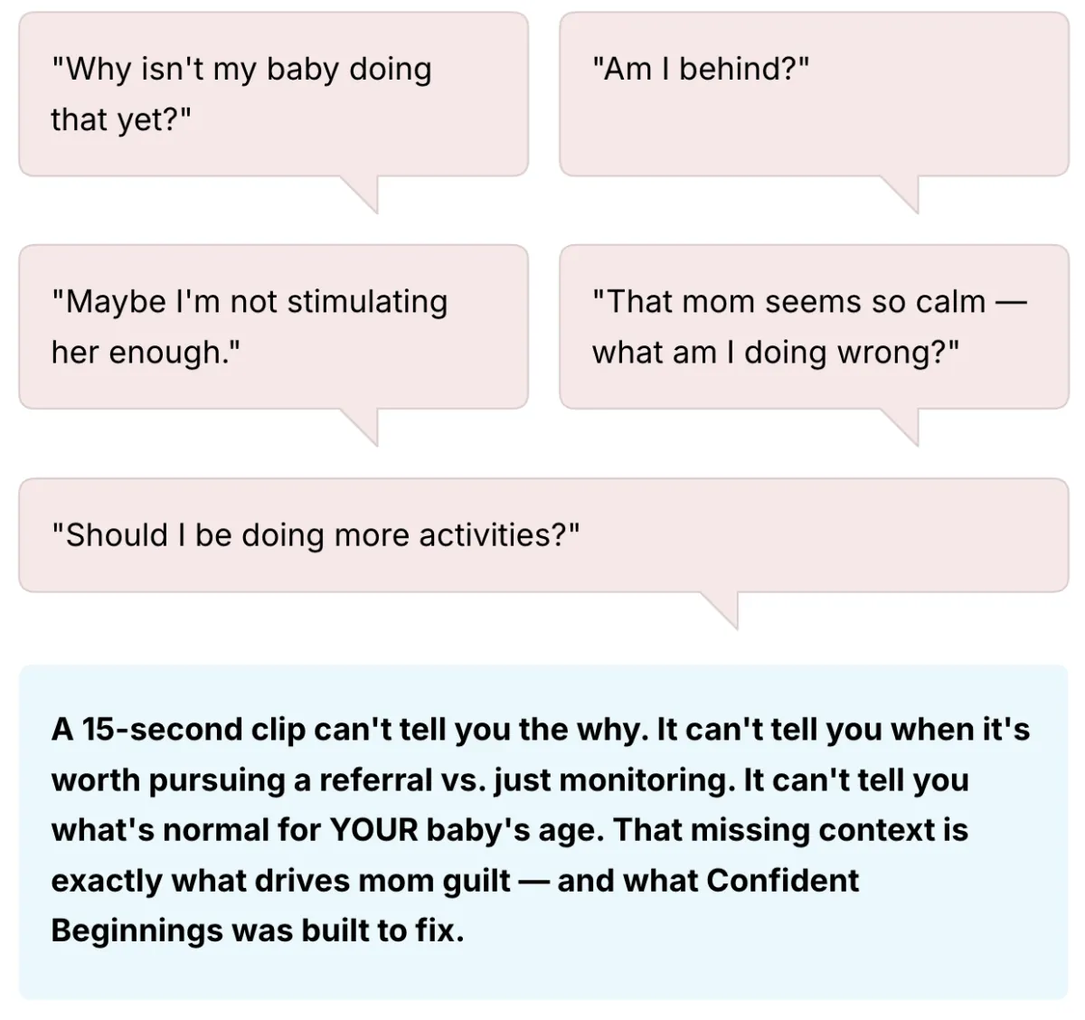 Confident Beginnings gives first time moms specialist-backed virtual guidance to catch red flags early, understand what's actually normal, and stop second-guessing every milestone. Built for moms who don't want to wait until something is wrong to get the right answer.