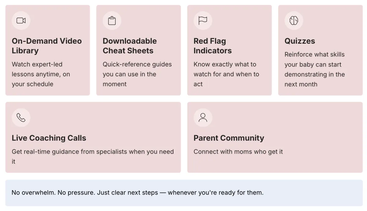 Between the video library, cheat sheets, survival guides, quizzes and calls, you'll be able to identify red flags, be a better advocate for your baby, and learn how to make the most of your wake windows.